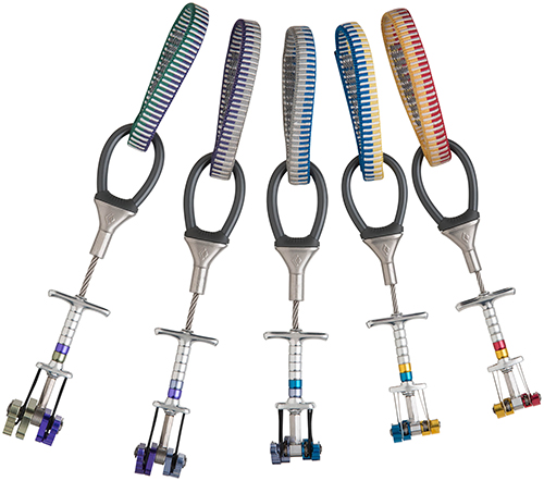 Doble eje en las medidas(.75/.5 y .5/.4) y eje apilado en las medidas (.4/.3, .3/.2 y .2/.1) que permite un gran rango de expansión. Cabeza angosta y levas irregulares le permiten ajustarse en lugares disformes e irregulares. Armadura de aluminio protege el cable sin sacrificar flexibilidad, la barra del gatillo esta termo formada lo cual le permite mayor fortaleza y perfecta ergonomia. Levas exteriores anodizadas y diferentes colores en la dinema para diferenciarlos fácilmente.